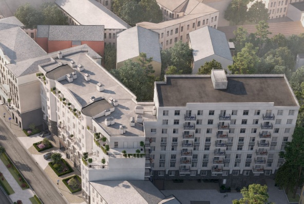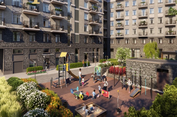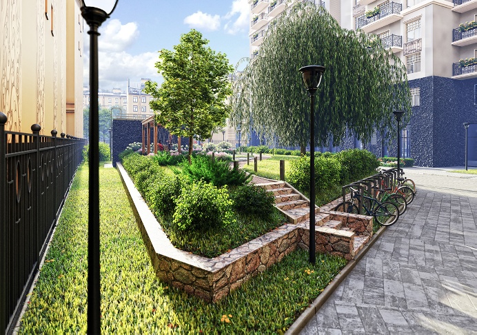 Территория дома закрытая, она состоит из двух внутренних дворов, скрытых за классической оградой. В малом дворе располагается открытая гостевая парковка для жителей, а в большом будет разбит солнечный зеленый сквер с обустроенной велопарковкой и детской площадой с  игровым и спортивным оборудованием.