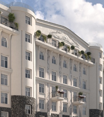 и облицовкой из натурального камня. Изысканная расстекловка окон и ажурные балконные решетки соседствуют с массивным полуциркулярным фронтоном, выигрышно подчеркивая друг друга.